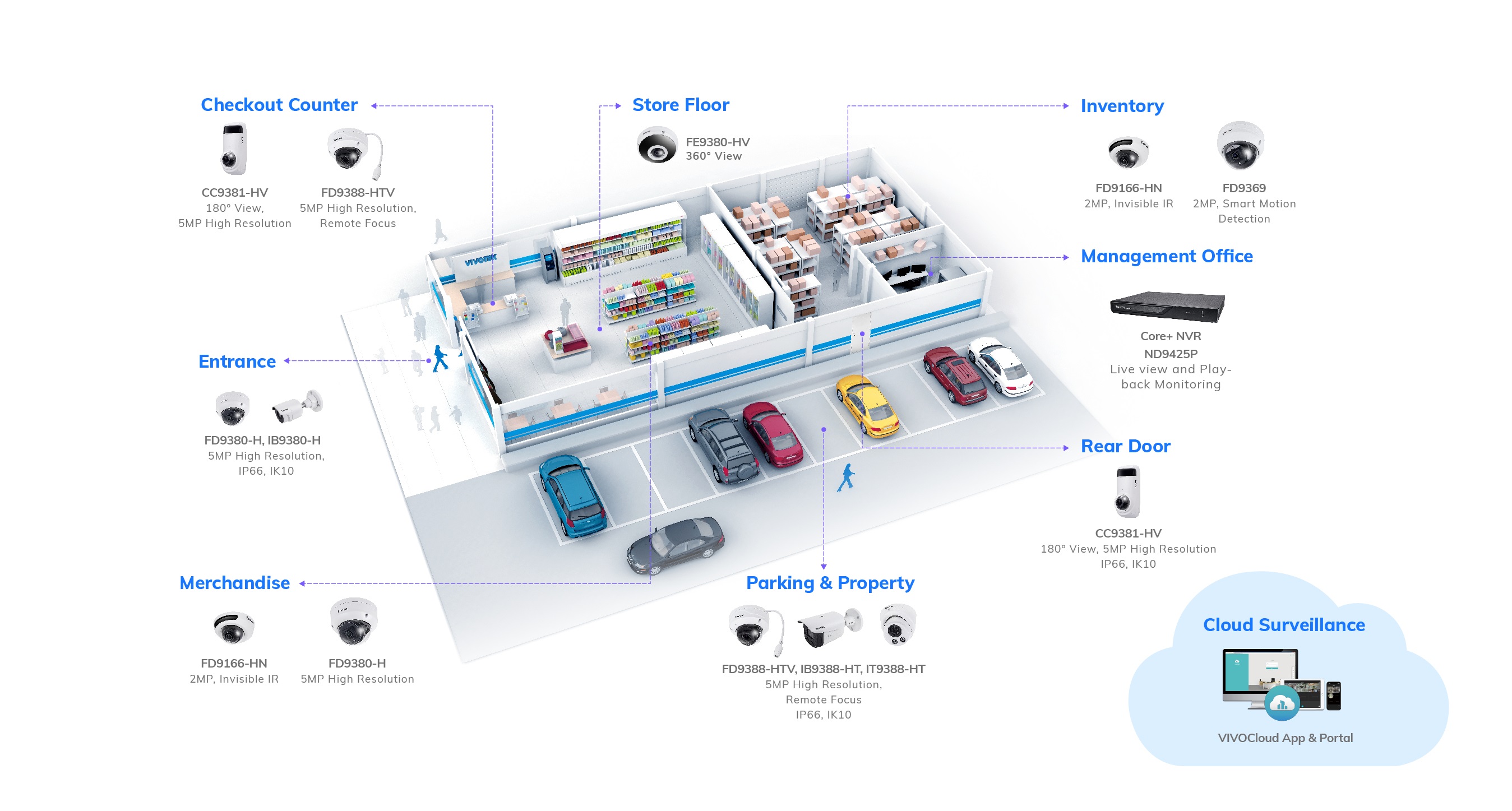 El sistema de vigilancia IP de VIVOTEK ofrece una línea completa de productos de cámaras IP, NVR Core+, servicio en la nube - VIVOCloud y VAST 2 CMS. Esto permite sistemas totalmente integrados que brindan estabilidad a largo plazo, así como ahorros de tiempo y costos en la instalación y el mantenimiento.