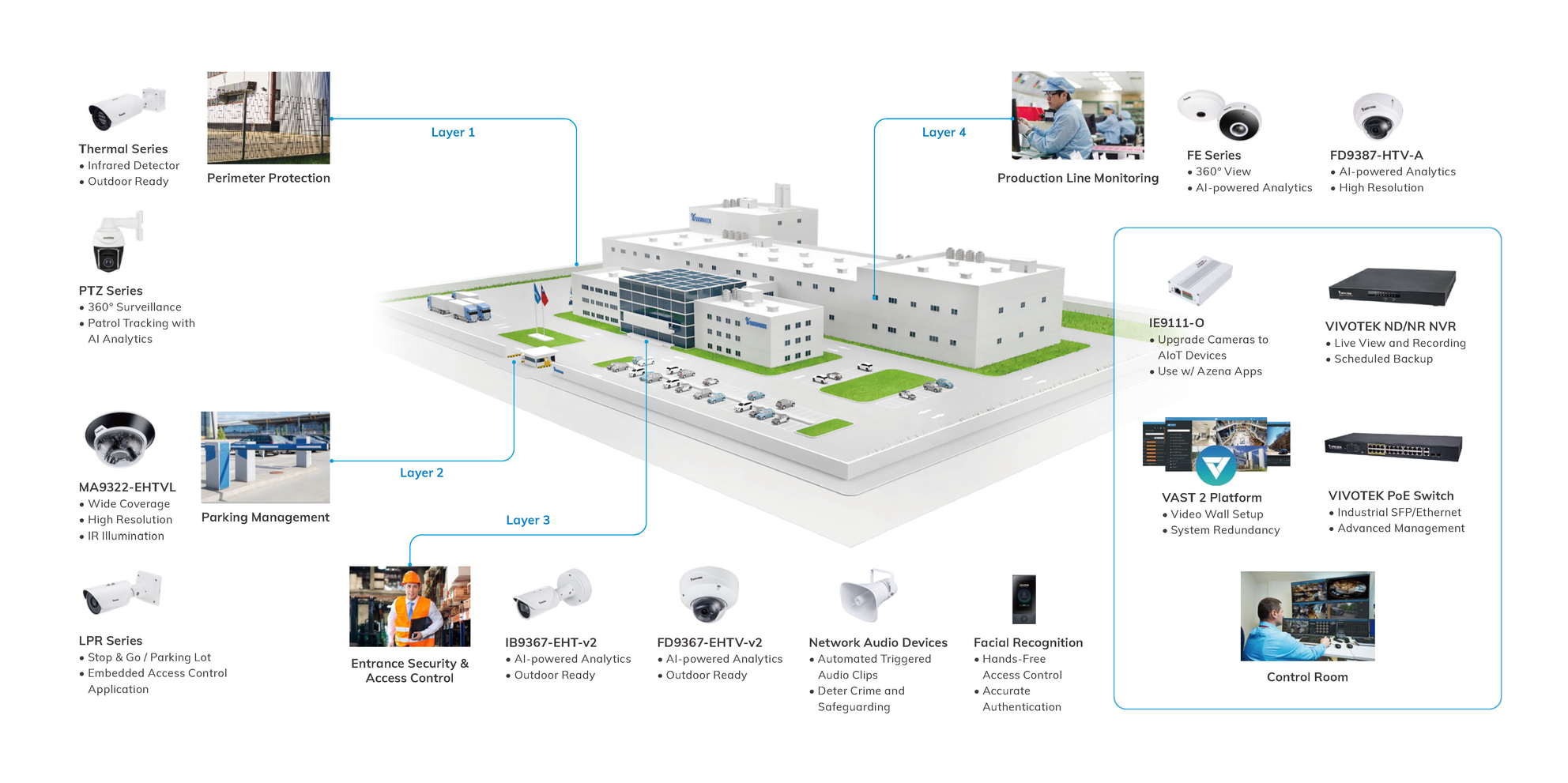 VIVOTEK ofrece una variedad de cámaras de red que brindan a las fábricas protección multicapa, asegurando instalaciones y propiedades. Se pueden aplicar cámaras ojo de pez de 360°, domo de velocidad (PTZ) y multisensor para una cobertura integral y protección perimetral. Las cámaras de la serie LPR y los dispositivos de reconocimiento facial pueden capturar matrículas y facilitar el control de acceso, respectivamente. Además, las cámaras domo y bala fijas con calidad de imagen nítida y análisis basados en IA pueden integrarse y activar nuestros altavoces de audio en red, advirtiendo a los intrusos sospechosos antes de que cometan un delito, así como manteniendo evidencia clara en los videoclips.