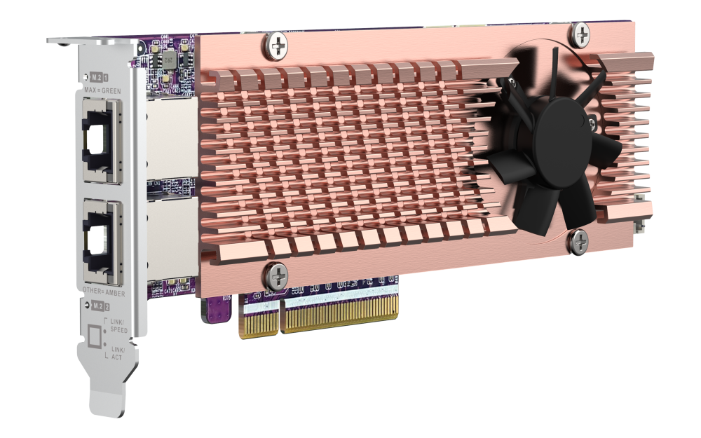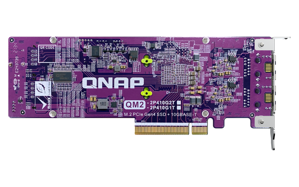 La QM2-2P410G2T le permite añadir fácilmente SSD M.2 NVMe y conectividad RJ45 10GbE a su PC/estación de trabajo. La QM2-2P410G2T incluye un controlador Broadcom®, y la interfaz PCIe 4.0 ofrece un mayor ancho de banda para proporcionar una mayor velocidad de procesamiento y un acceso más rápido a los datos.