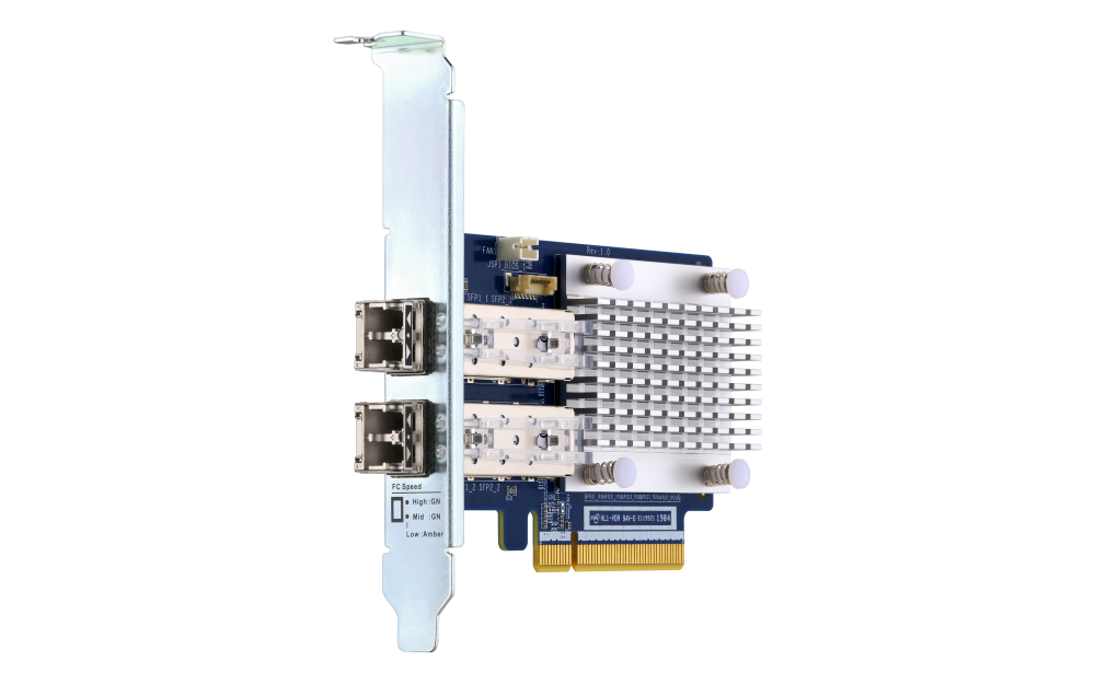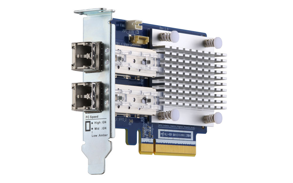 Las redes de área de almacenamiento (SAN) de Canal de fibra común son entornos de red cerrados y sus dispositivos suelen ser caros, aunque les falta flexibilidad para la implementación. QNAP presenta las tarjetas de expansión de Canal de fibra de 16Gb/32Gb y dos puertos que presentan un alto rendimiento, fiabilidad, seguridad y eficiencia energética. Con una tarjeta de Canal de fibra de QNAP en su NAS de QNAP, podrá añadir su NAS a un entorno de red SAN existente a un precio asequible para responder a las necesidades de almacenamiento y copia de seguridad de alto rendimiento.