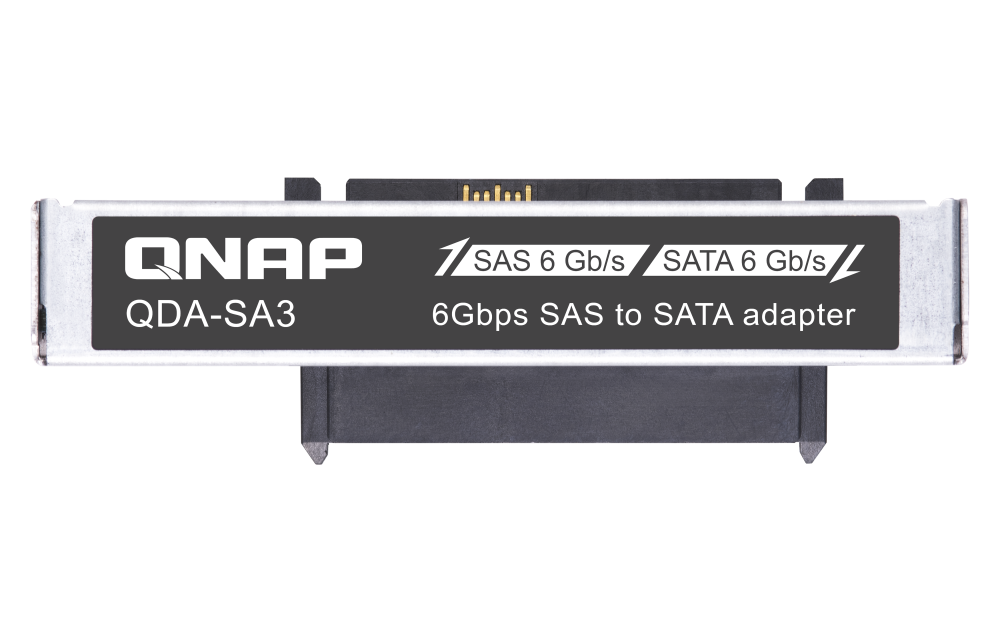 El adaptador QDA-SA3 está diseñado para el NAS ZFS empresarial all-flash de dos controladores de QNAP (ES2486dc) y permite el uso de una unidad SATA de 6Gbps en una bahía para unidades SAS de 2,5" a 12Gbps/6Gbps, lo que permite ampliar la capacidad de almacenamiento utilizando unidades SATA económicas.