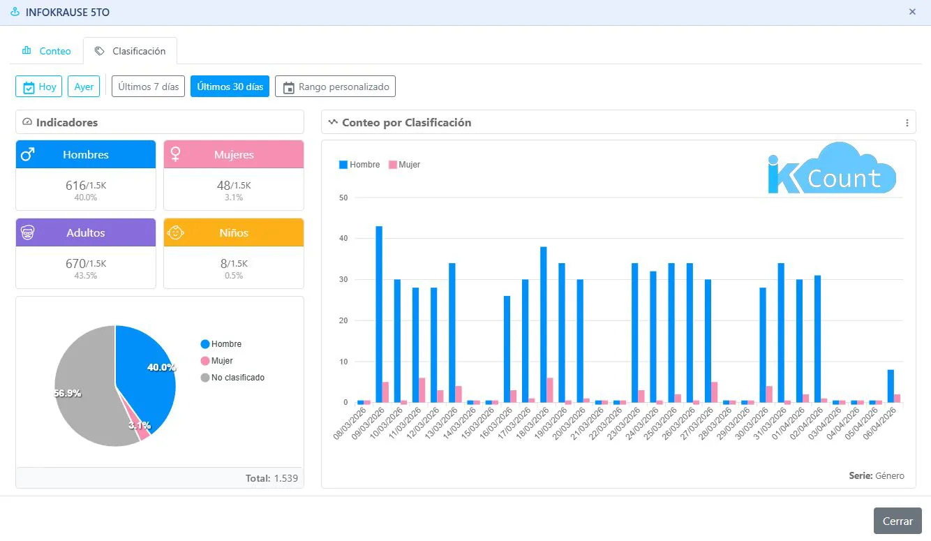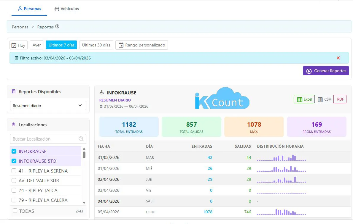 Registro histórico del flujo de visitantes por día, semana, mes, año... Visualización de datos en tiempo real.