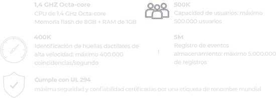 Con un diseño enfocado en sistemas de nivel empresarial, CoreStation gestiona hasta 500 000 usuarios con una increíble velocidad de identificación de huellas dactilares de hasta 400 000 coincidencias por segundo. Bajo las premisas de alto rendimiento, lectura biométrica y comunicación por Ethernet, CoreStation es capaz de ofrecer la totalidad de las características de la plataforma BioStar2.