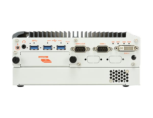 PC de caja sin ventilador Intel® Elkhart Lake Atom® x6425E con 4x GbE, 7/15 mm 2.5" HDD y casete de expansión PCIe y control de potencia de encendido