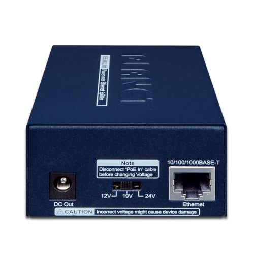 El divisor de alimentación a través de Ethernet Gigabit 802.3bt PLANET POE-173S, que proporciona datos digitales Ethernet y alimentación PoE desde un equipo de fuente de alimentación (PSE) PoE++ tipo 4 802.3bt a través de un cable UTP, viene con un interruptor DIP seleccionable de 12 V, 19 V o 24 V CC, que permite proporcionar una salida de potencia máxima de 60 vatios a un dispositivo Ethernet sin alimentación PoE. Admite conexión Ethernet pasiva de 10/100/1000 Mbps y una distancia de hasta 100 metros.