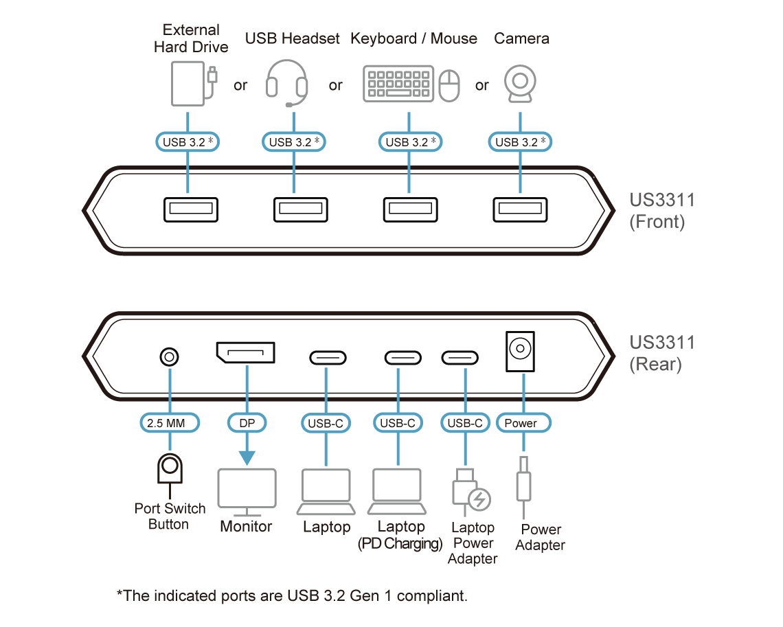 - 1x US3311 Conmutador KVM 4K DisplayPort USB-C de 2 puertos con paso de corriente | Duo Flex (8K, USB 3.2 / 4.0, compatible con Thunderbolt 4)