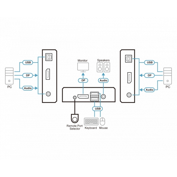 - Una consola de vídeo DisplayPort controla dos PCs USB.